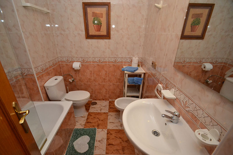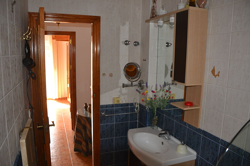 Das Haupt-Badezimmer befindet sich in der ersten Etage. Hier gibt es eine Dusche, ein WC, ein Waschbecken. Auch ein Kosmetikspiegel und ein Fön sind vorhanden.