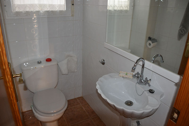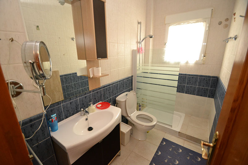 Das Haupt-Badezimmer befindet sich in der ersten Etage. Hier gibt es eine Dusche, ein WC, ein Waschbecken. Auch ein Kosmetikspiegel und ein Fön sind vorhanden.