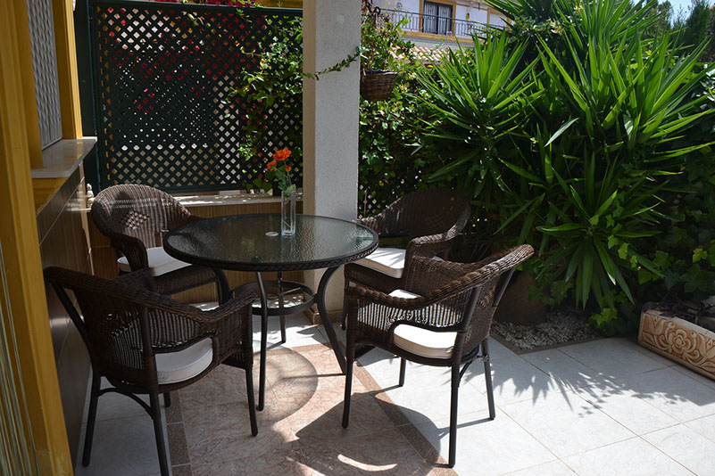 Die gemütliche Terrasse ist mit schönen Gartenmöbeln ausgestattet und lädt zum Frühstück im Freien ein.